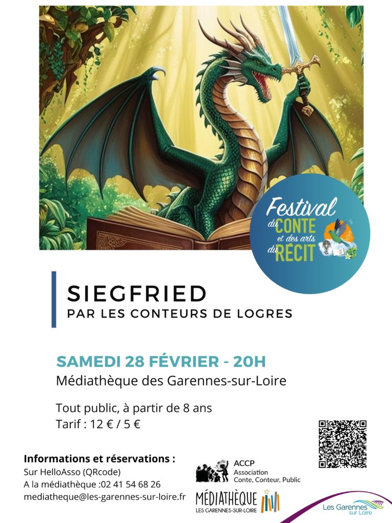Dans le cadre du Festival du Conte et des Arts du Récit des Garennes-Sur-Loire (49), Les Conteurs de Logres ont la joie de présenter » Le Conte de Siegfried » à la Médiathèque de Juigné-sur-Loire le Samedi 28 février à 20h00. A partir de 8 ans, Adultes : 12 euros, Enfants : 5 euros. Informations et réservations : 02 41 54 68 26.